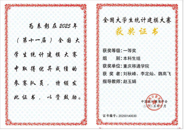 近日,2025年(第十一届)全国大学生统计建模大赛在东北财经大学圆满落幕。重庆移通学院代表队荣获全国总决赛本科生组一等奖,实现了该校在该赛事的历史性突破,也是本届大赛中获得全国一等奖唯一一所民办类院校。