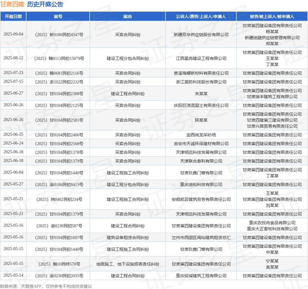 本站消息,根据天眼查APP显示,近日公布了一则甘肃第四建设集团有限责任公司作为被告/被上诉人的开庭公告,详细内容如下: